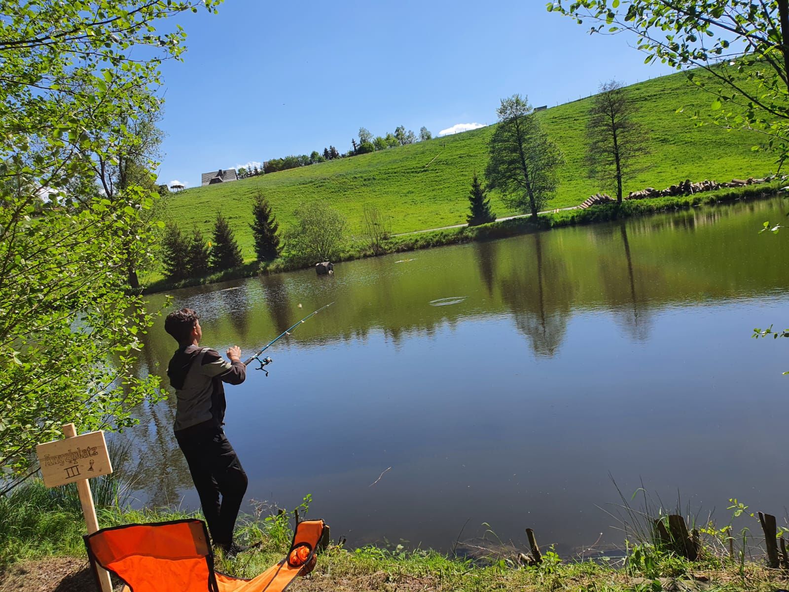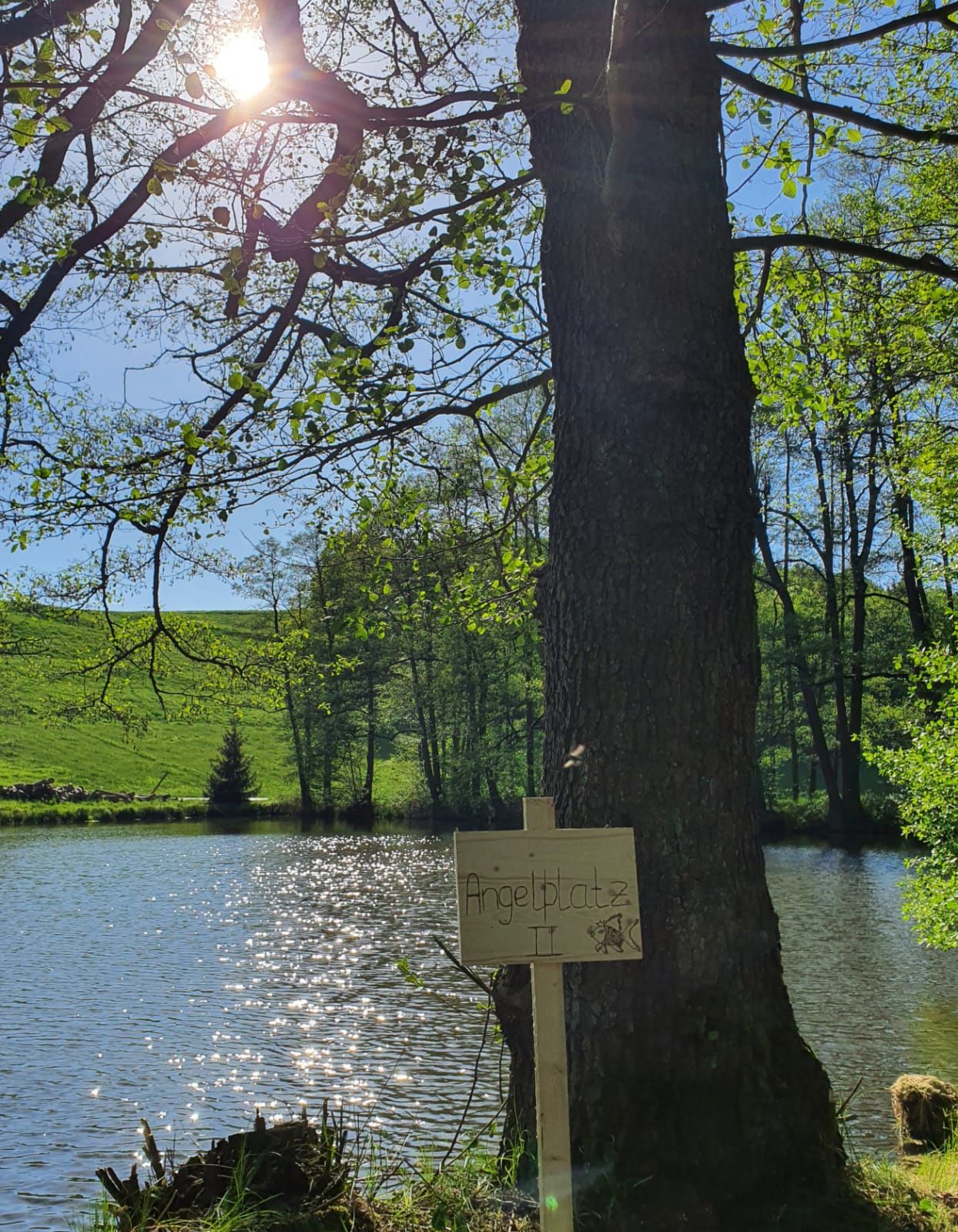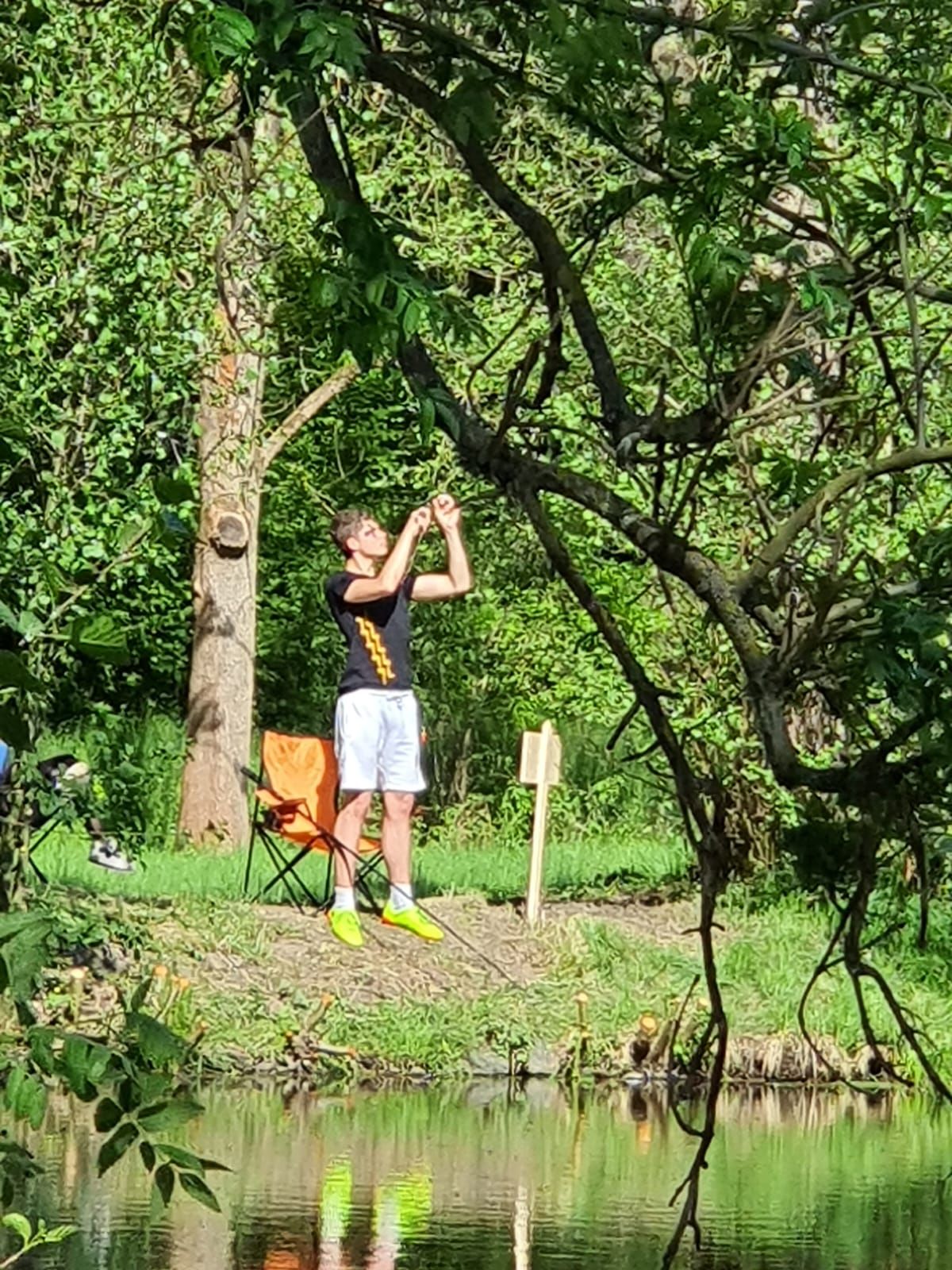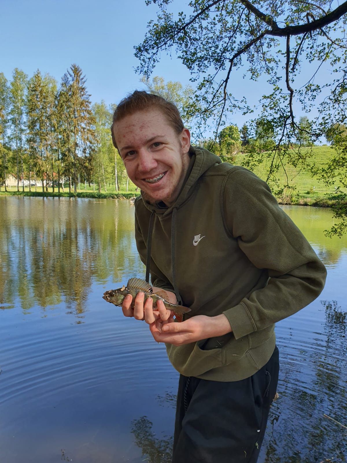 Insbesondere beim Angeln war Ruhe und Entspannung angesagt. Nachdem am Vormittag die Angelruten selbst zusammengebaut und betriebsbereit gemacht wurden, konnten sie nun endlich zum Einsatz kommen. Anfüttern und die Wahl des „richtigen“ Angelplatzes standen nun an oberster Stelle. Besonders toll fand ich, dass unsere „alten“ Angelhasen sich sehr um die neuen Angelinteressierten kümmerten. Keine Erklärung war zu viel oder Frage zu lästig. Es wurden Teams gebildet und schon ging es los. Leider waren Wind und Angelglück uns nicht sehr gewogen. Nach zwei Stunden wurde es Zeit fürs Abendessen und alle sollten einpacken. Just in diesem Moment konnte Leon den einzigen Fisch des Tages fangen und war sehr stolz darauf. Der kleine Barsch durfte nach einem kurzen Erinnerungsfoto wieder seine Freiheit genießen und zog in die „Untiefen“ des Teiches davon.